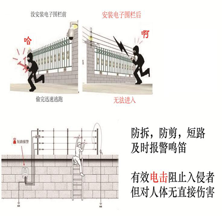 電子圍欄新的安防構思,是以阻擋爲主,報警爲輔。以阻擋、報警、監控爲一體 ,系統對入侵者給予瞬間脈沖電擊。具有極強的威懾作用。防止事件的發生,減少事件後處理工作量,減少社會犯罪率。電子圍欄可同警燈、警鈴、攝像等聯合使用,可遠程監控,可形成智能化。